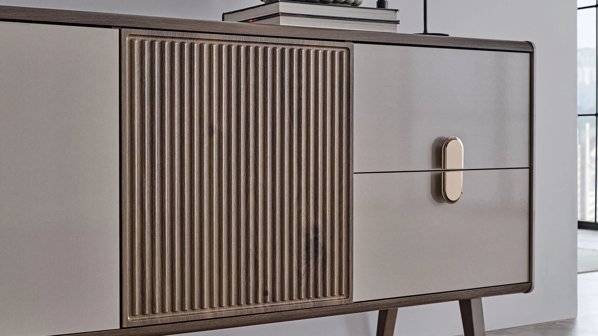 The Doğtaş Bend Console brings the warmth of wood to your space while its light-colored, glossy surfaces enhance bright and minimalist interiors. Finished with bronze-coated handles, slender metal legs, and distinctive profile details, this console serves as both a stylish focal point and a functional storage solution.