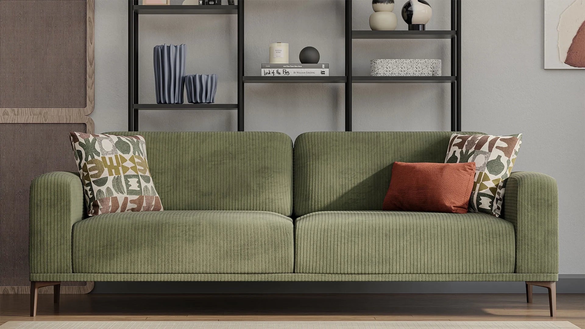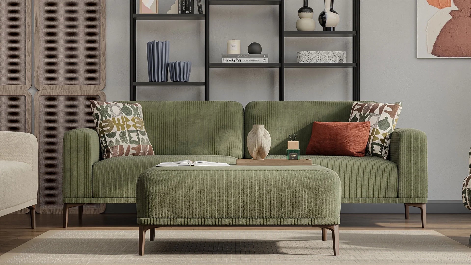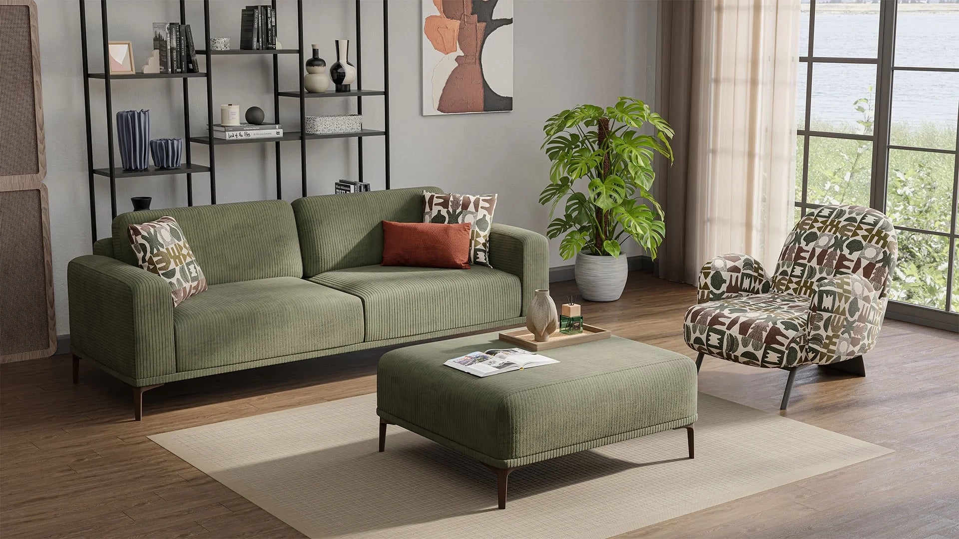 Standing out with earthy tones like khaki, cream, and brown, the Calista Sofa Set offers plenty of color options to match your decor. Add vibrance to your space with a multicolored or patterned armchair, or use the ottoman as a coffee table or a cozy lounge piece. Create your own unique atmosphere with Calista!