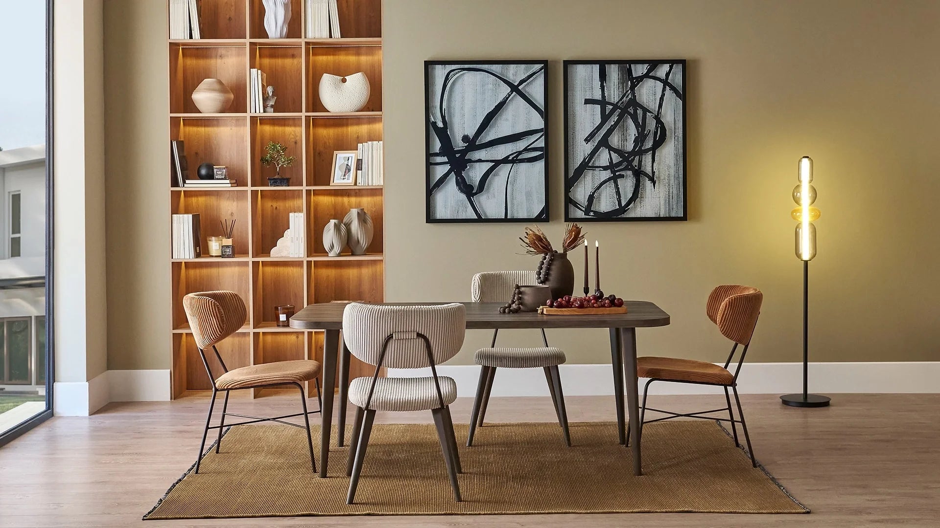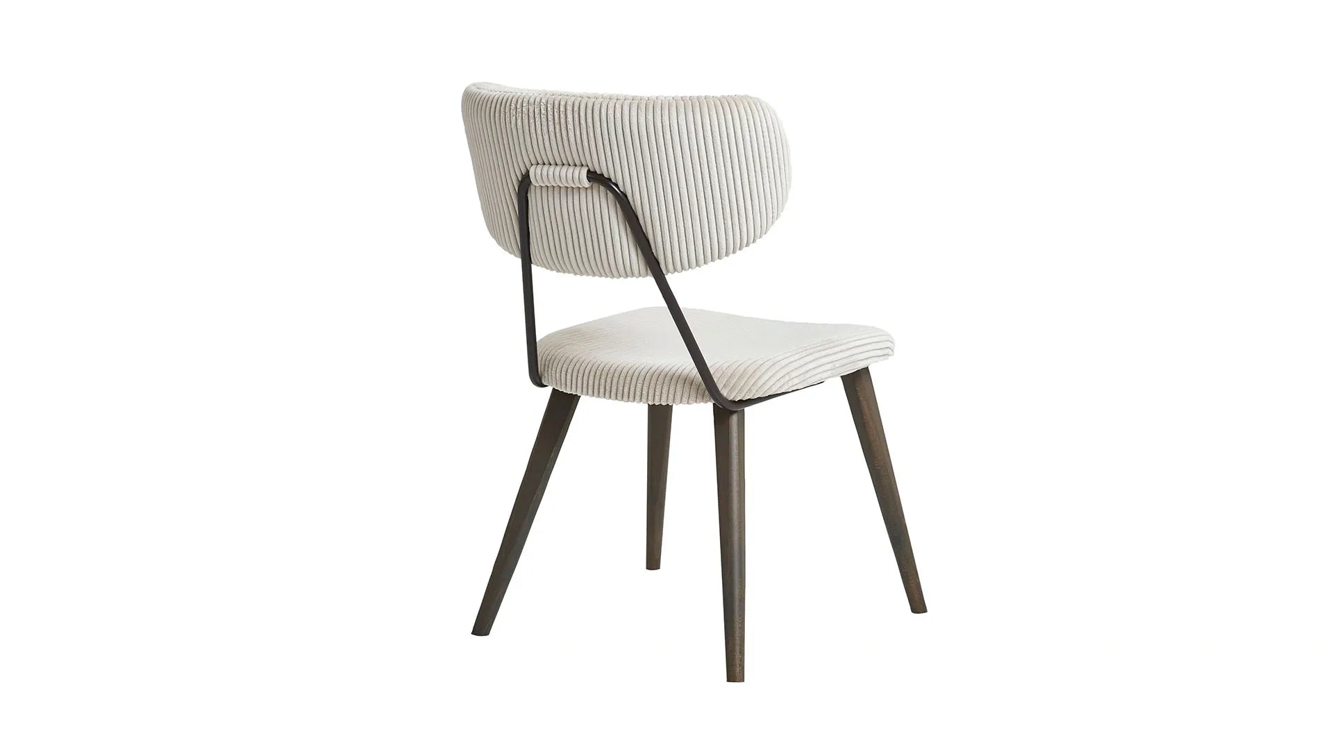 The Lea Wooden Chair is a stunning blend of comfort and contemporary design. With outward-angled walnut-colored wooden legs, a soft rounded backrest, and a stylish metal-accented opening, this chair brings both elegance and support to your dining space. The ribbed, velvet-textured fabric in a warm cream tone enhances its modern look.