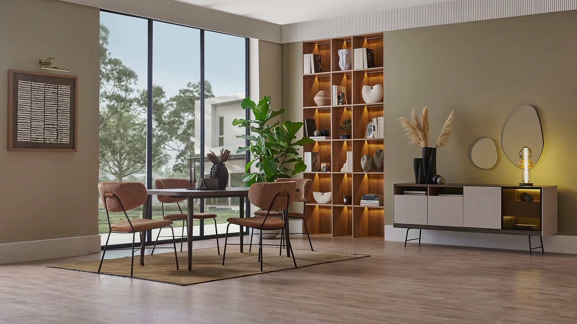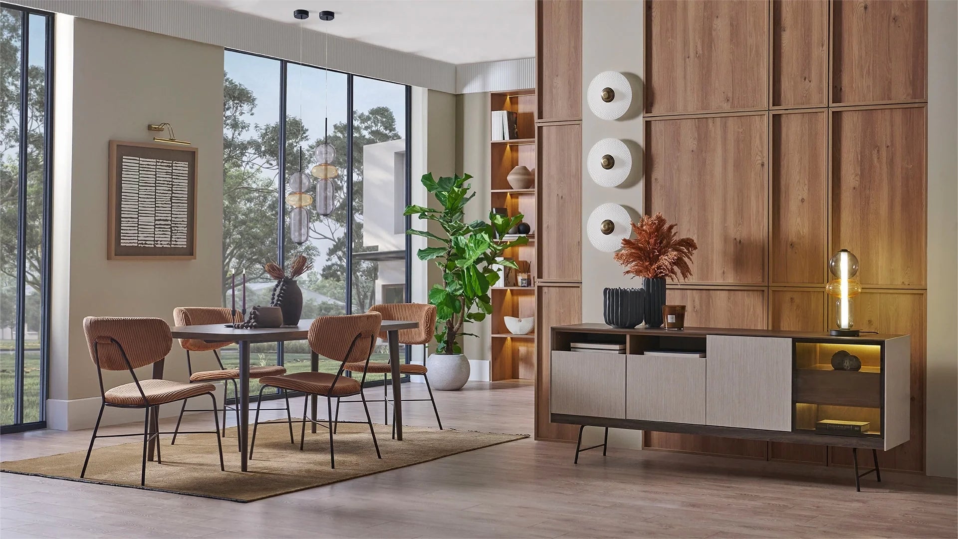 The Lea Collection captures a perfect balance of sophistication and simplicity. Designed with bold dark oak tones and refined textile textures, this dining room set delivers a warm yet contemporary ambiance.