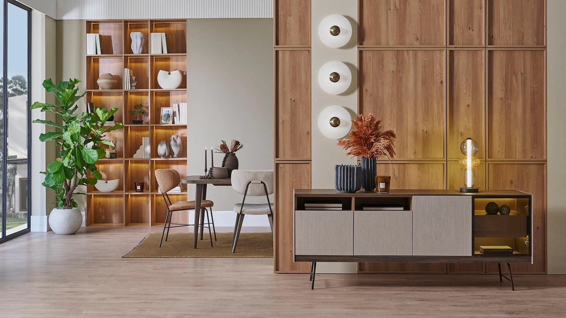 - Elegant Materials: A rich mix of wood, glass, metal, and fabric creates a layered, natural look.