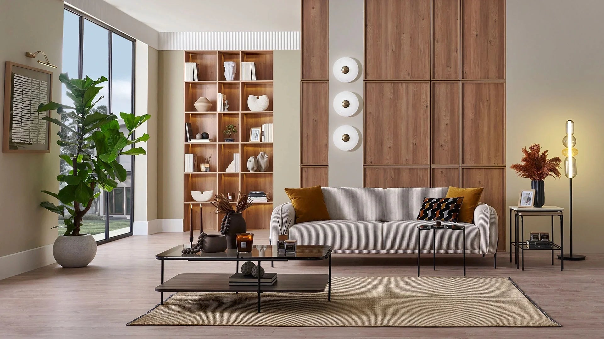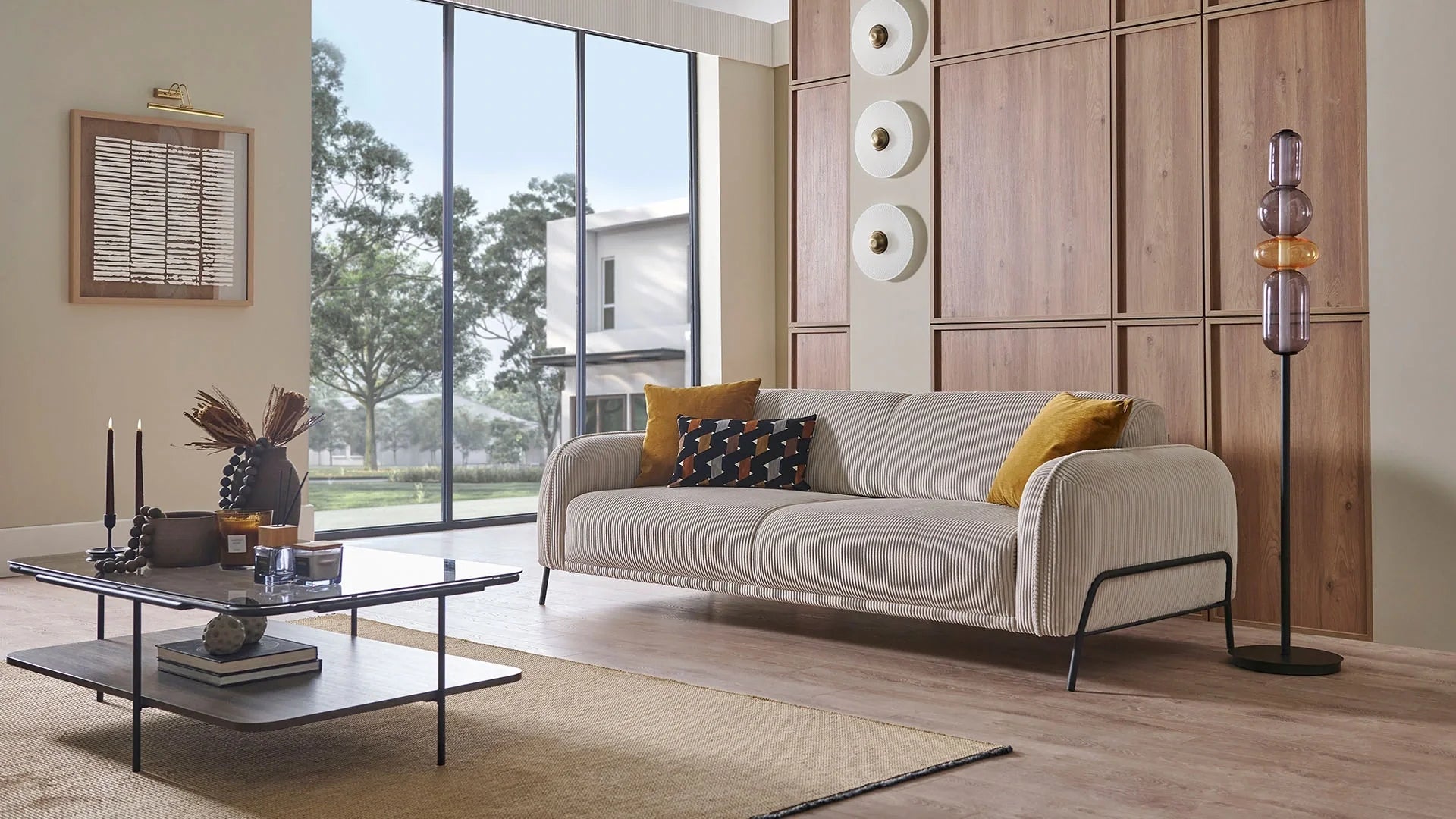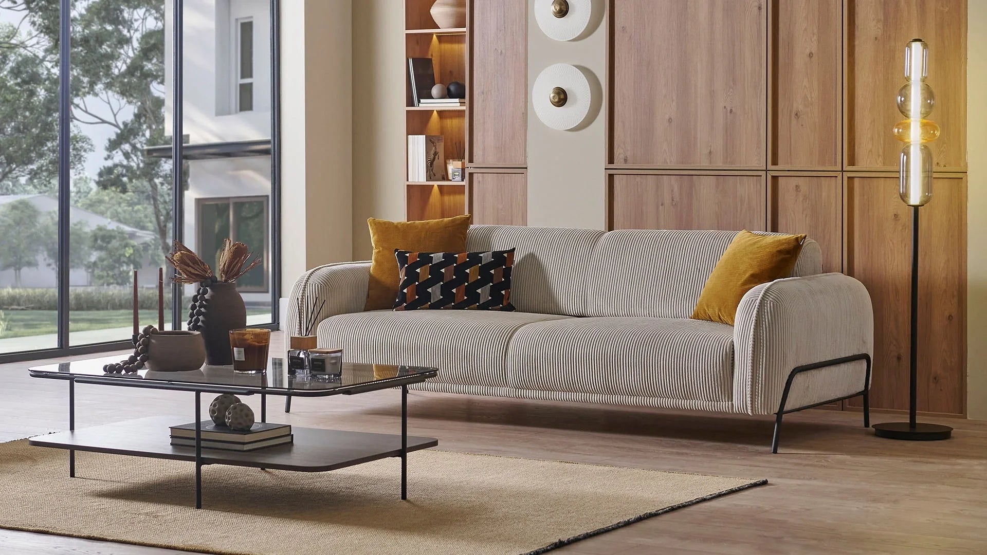 The Lea 3 Seater Sofa Bed combines comfort and practicality with a modern edge. Upholstered in velvet-textured cream fabric and featuring sleek black metal legs, it stands out with its clean silhouette and soft cushioning. The Barcelona mechanism offers an easy transformation into a bed, making it ideal for both everyday use and hosting overnight guests. Complete with decorative pillows in mustard knit and multicolor chenille patterns, the Lea Sofa brings warmth and character to your space.