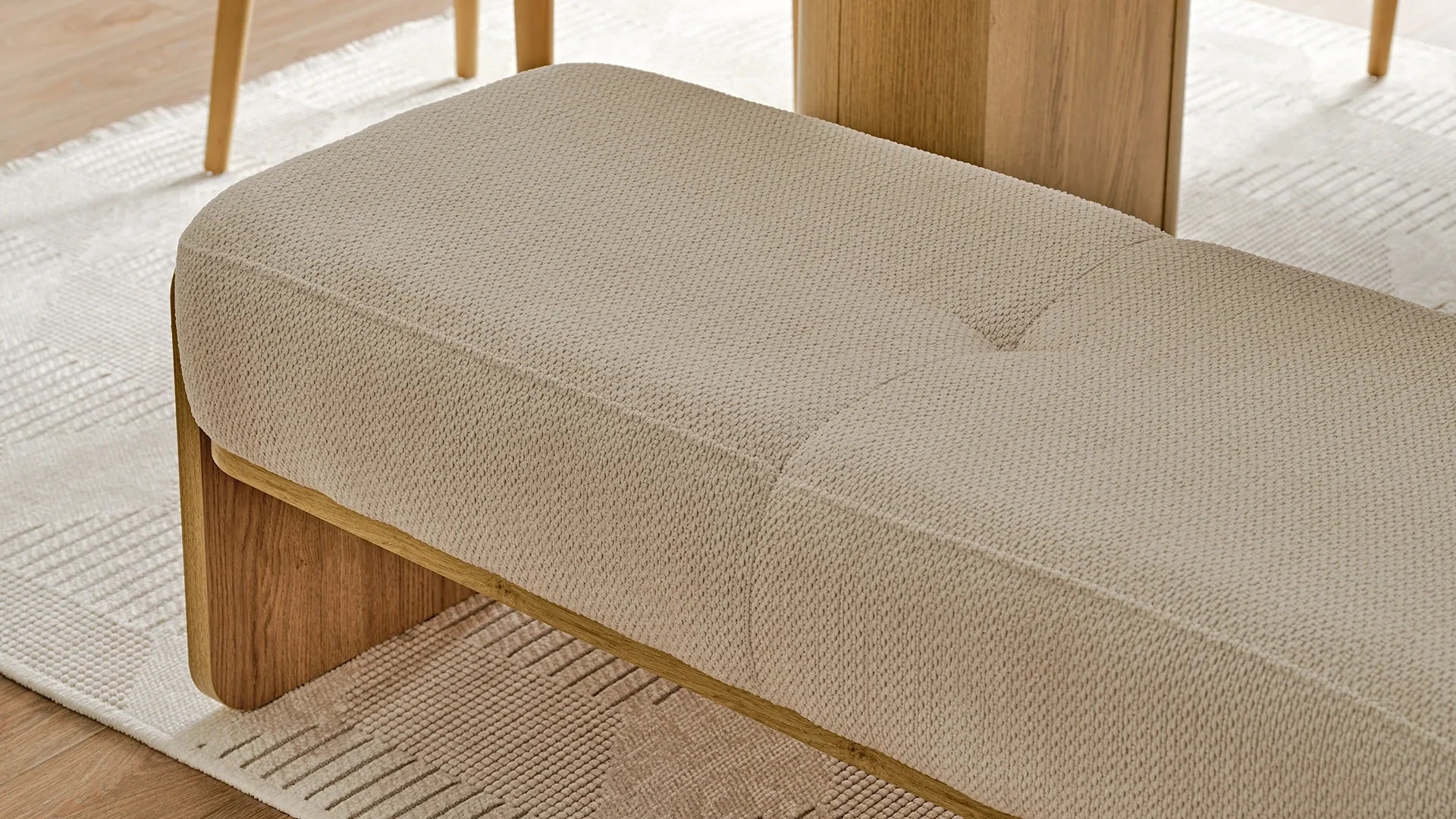 The Legna Bench combines elegance and functionality with its minimalist design and natural materials. Its light wood finish creates a warm, welcoming atmosphere that seamlessly fits into modern interiors. The cream-colored upholstered cushion on top enhances comfort, making it perfect for everyday use.