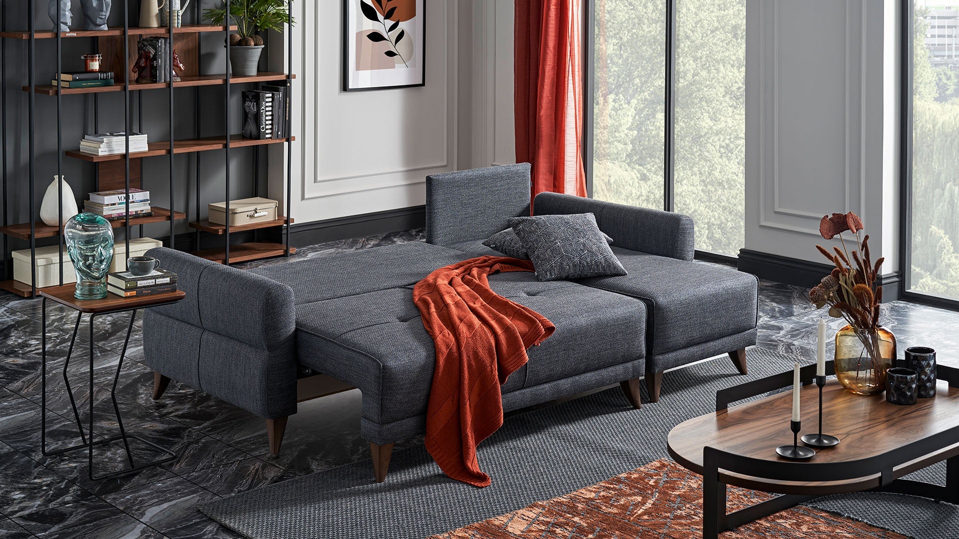 Mila Corner Set turns narrow spaces into stylish and useful ones, enriching its modern and minimal design with functional details. The stitch details on the seat, arm, and back cushions of Mila Corner Set add movement to the set, referring to today's trends with linen fabrics with different color options and geometric patterned throw pillows. It also offers double beds for guests and provides extra storage space. Discover now!