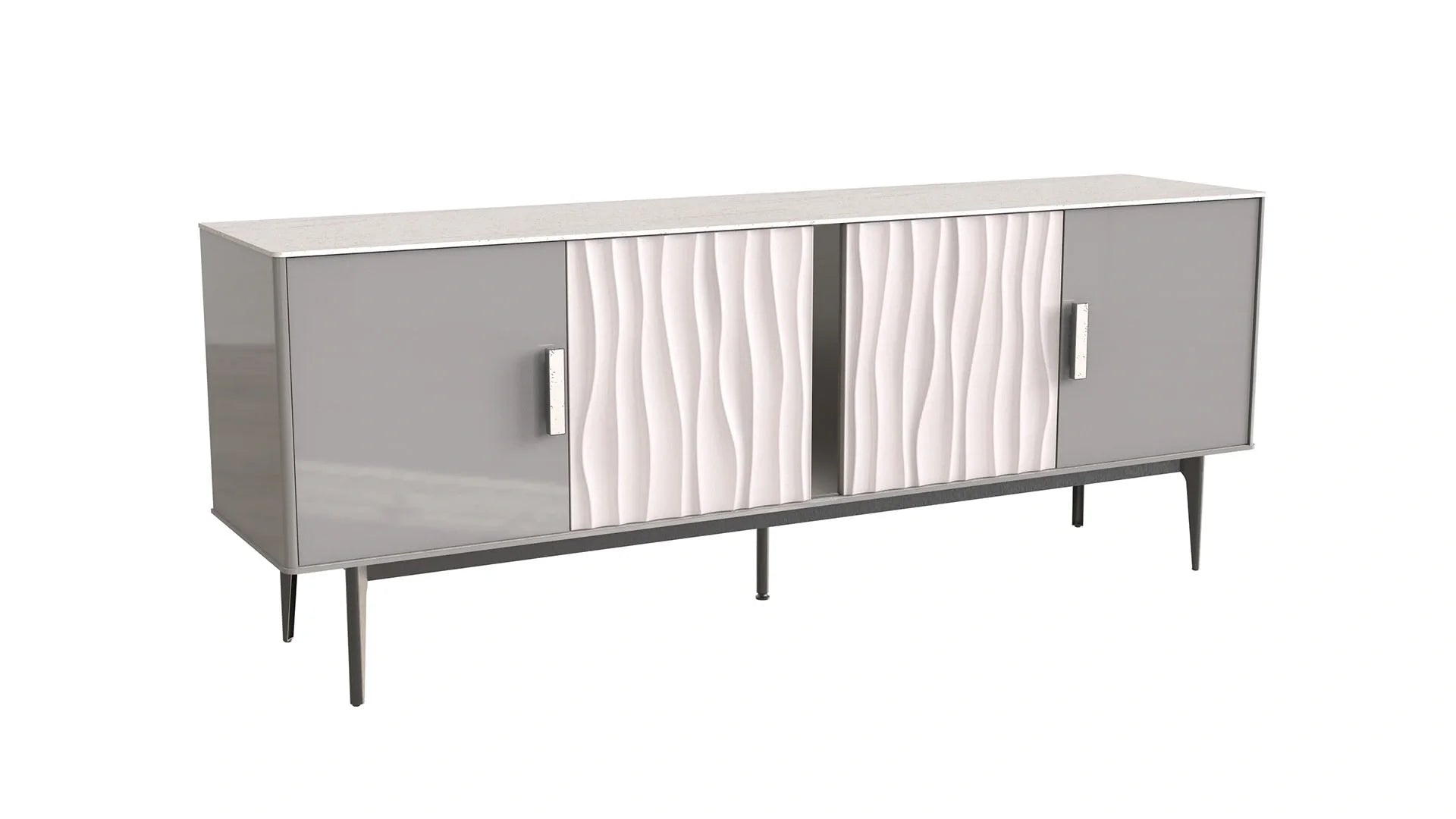 Featuring four spacious compartments, it provides ideal storage for dinnerware, glasses, or other dining essentials that you prefer to keep out of sight. Its innovative design includes a combination of wavy and flat door fronts, creating a dynamic and sculptural effect that adds texture and visual intrigue to your space.