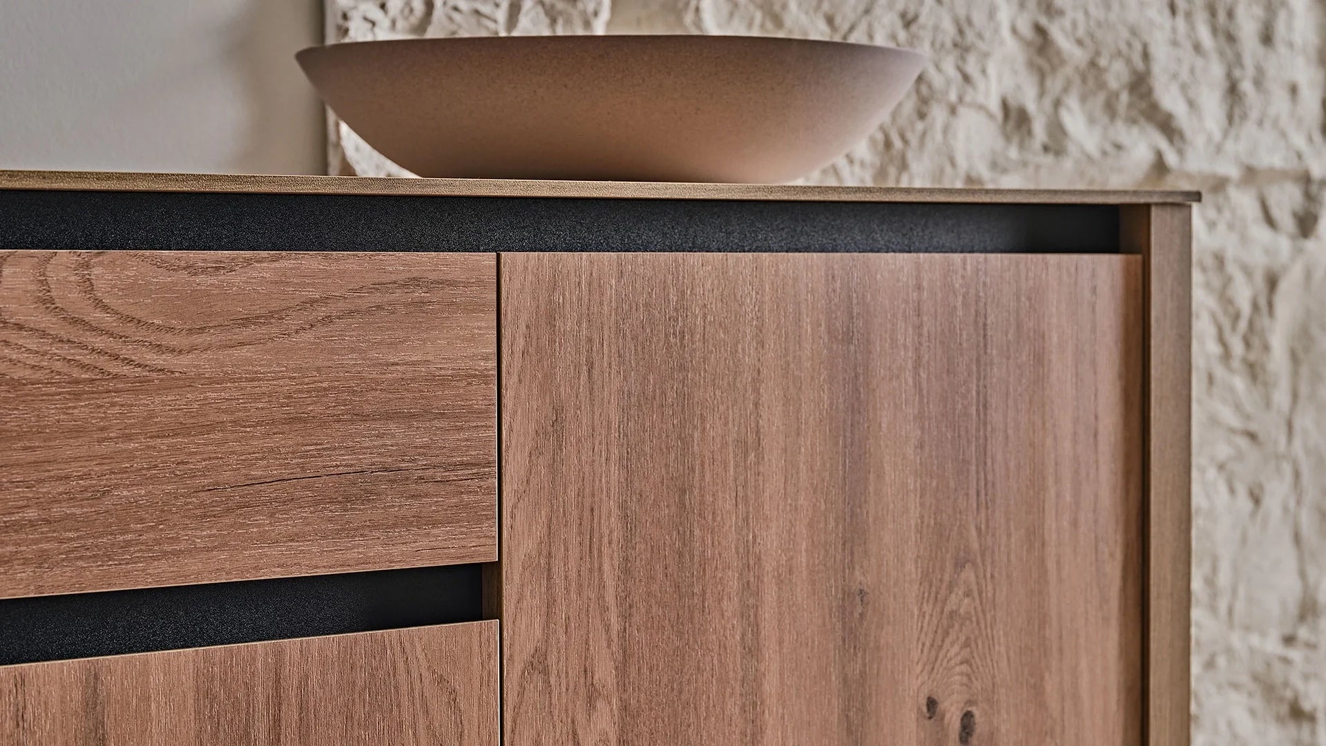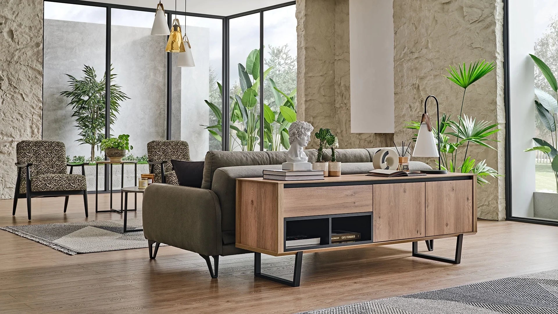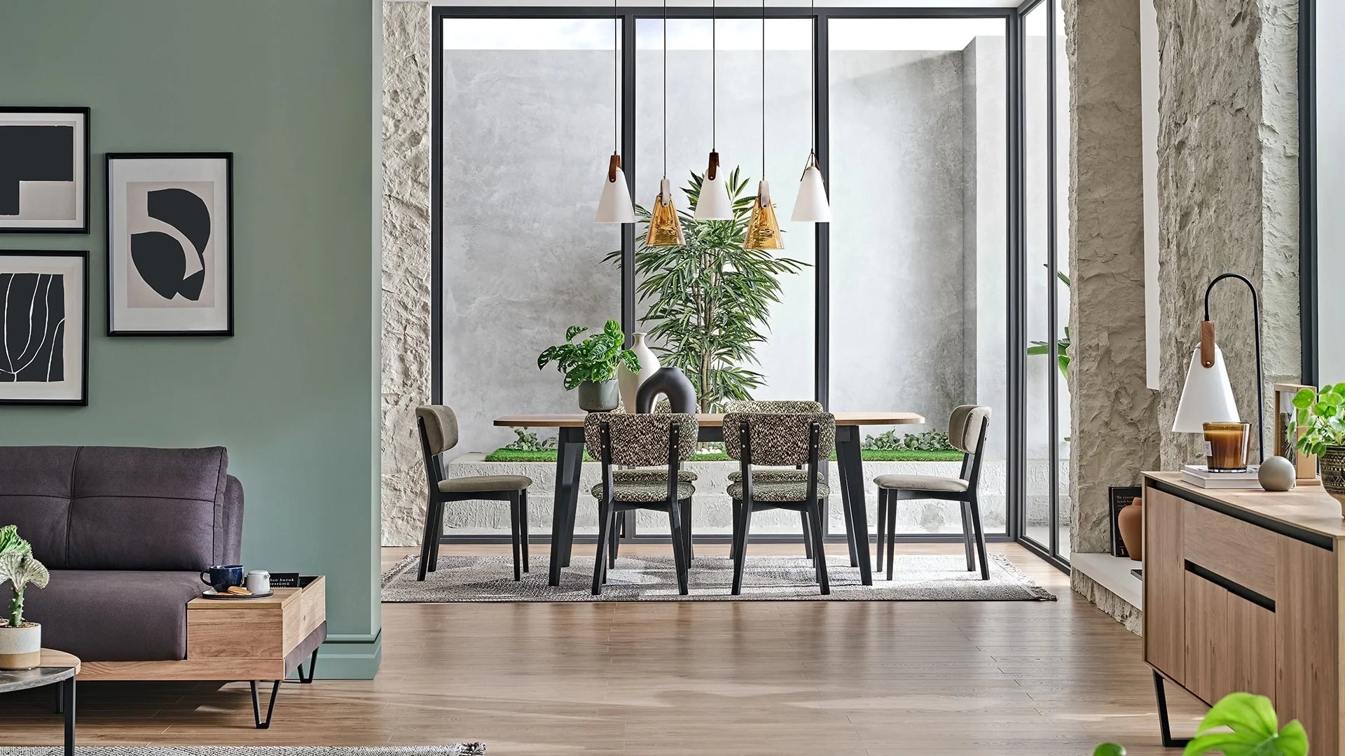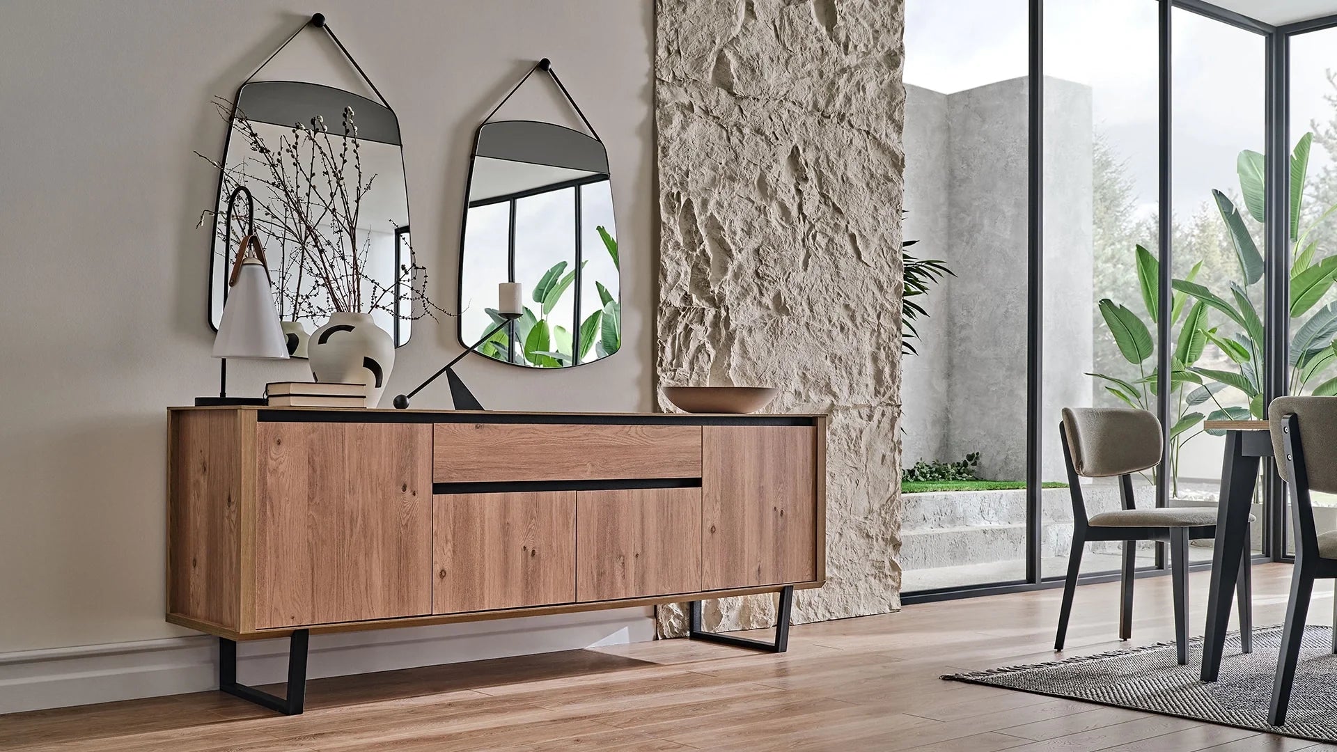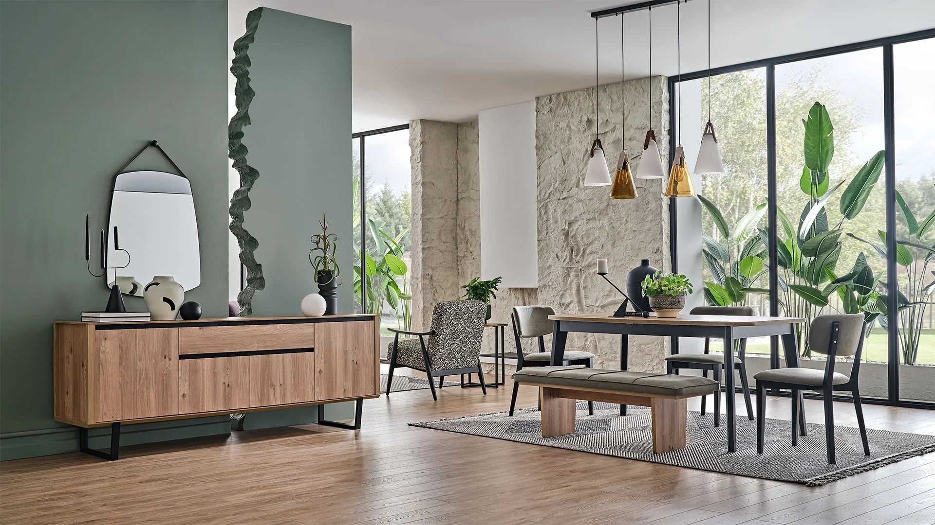 Solid Dining Room Set beautifully combines the natural warmth of Varna-colored wood with the strong presence of metal, enhancing your space with both functionality and stylish design. This product group reflects refined taste through its handleless cabinets, high legs, and clean lines. With its extendable dining table option, the Solid Dining Room Set also appeals to large families. Every detail reflects a minimalist and simple approach to decoration. Featuring a spacious storage console, a large and modern dining table, uniquely designed mirrors, and stylish chairs with distinctive patterns, this collection will add a whole new energy to your living space. You can enrich your dining set with other modules from the Solid collection—ranging from coffee tables and TV units to dressers and benches.